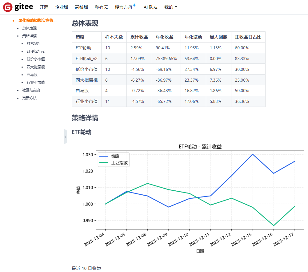 模拟实盘的运行结果会 每天更新到 Gitee 项目主页 ,感兴趣的朋友可以去围观吃瓜。